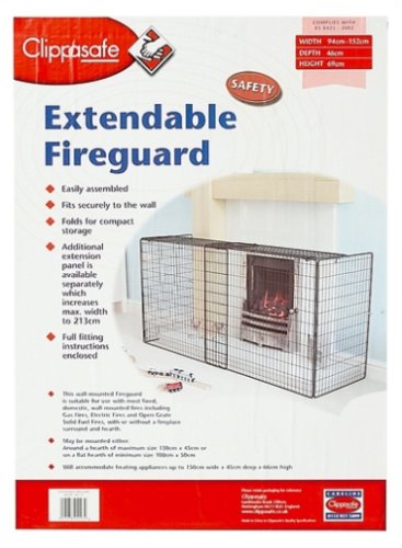 How's going? This day I'll introduce you about I will think This Interesting ,and you can see that The Clippasafe Adjustable & Extendable Fireguard is easily assembled and fits securely to the wall or fireplace surround. The Extendable Fireguard is suitable for use with most fixed, domestic, wall-mounted fires including Gas Fires, Electric Fires and Open Grate Solid Fuel Fires, with or without a fireplace surround or hearth.Cheers and have a GREAT day!