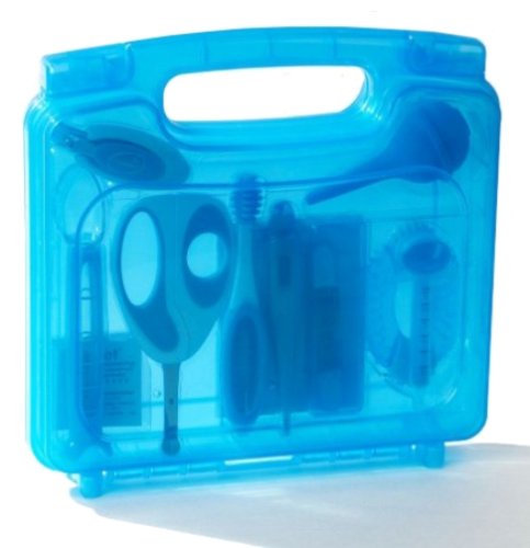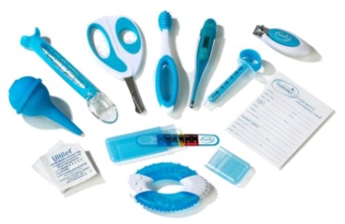 - items include scissors, nasal aspirator, teether, thermometer and medicine dropper and spoon.